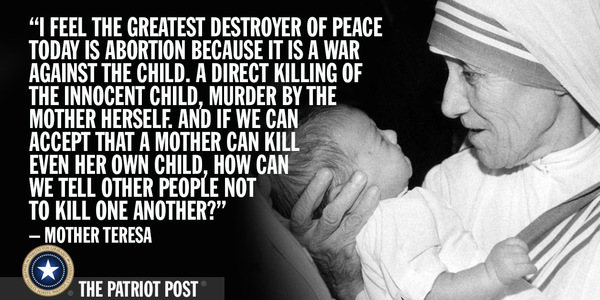I feel that the greatest destroyer of peace today is abortion, because it is a war against the child, a direct killing of the innocent child, murder by the mother herself."