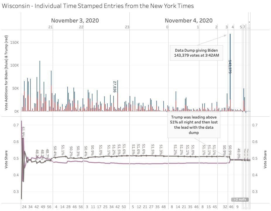 Wisconsin data dump at 3 a.m. tells it all. Trump was leading by over 100,000 votes. Same in Detroit where vans of ballots showed up at 3 a.m. and results were reversed and Biden won by 20,000 votes.